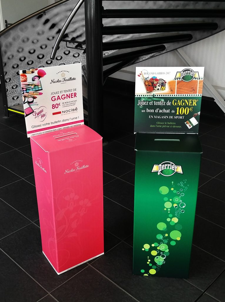 Cette PLV urne de jeu est conçue pour les animations commerciales en GMS, offrant un support pratique, esthétique et facile à installer pour dynamiser vos opérations promotionnelles.