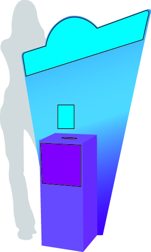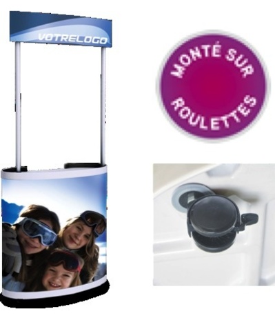 • Comptoir promotionnel en PVC, personnalisable et transportable grâce aux roulettes intégrées