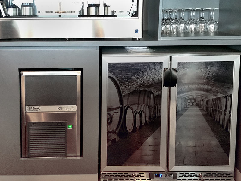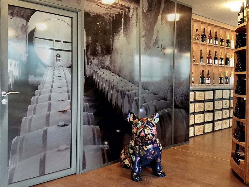 Pour Damoiseau Les Abymes – Cave 20/20, nous avons conçu une séparation harmonieuse des espaces grâce à un adhésif dépoli décoratif, imprimé en noir et blanc.